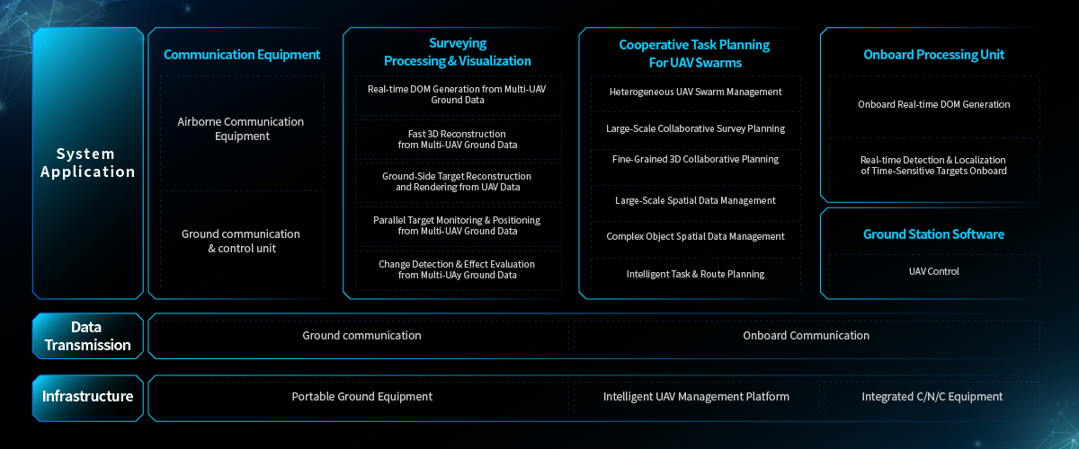 Taking “real-time on-board processing + intelligent ground-based management and control” as the core, DroneSwarm establishes a multi-level and highly reliable system architecture, realizing the integration of Communication, Navigation and Control (CNC) and full-process closed-loop operations.