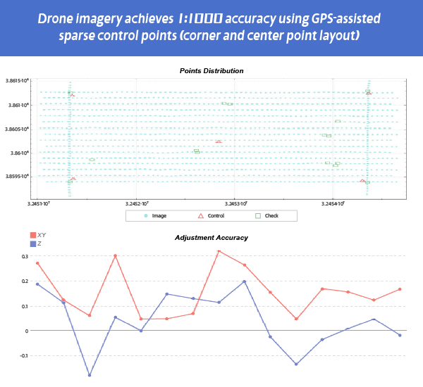 Supports GPS-assisted sparse control point adjustment (high precision via four-corner/four-corner + center layout) and control-point-free high-precision adjustment.
