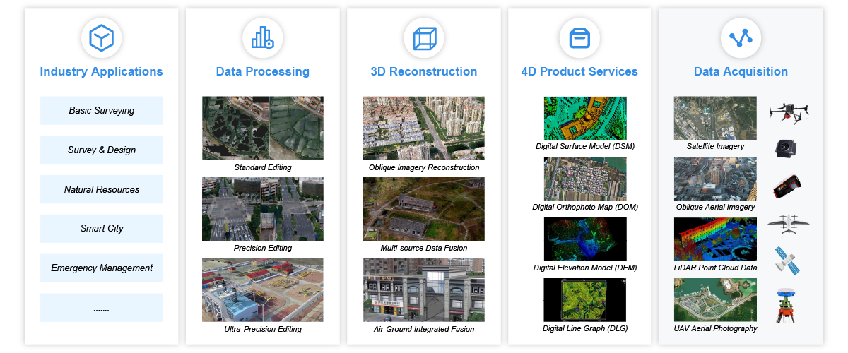 Relying the “space-air-ground” integrated data collection system and independently developed core modeling software Mirauge3D, we provide global customers with an end-to-end solution covering data collection, fusion processing, 3D reconstruction and application services.